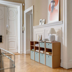 Du kannst das Regal flexibel an deine Bedürfnisse anpassen und immer wieder neu zusammenstellen. Die einzelnen Grundmodule werden horizontal und vertikal mit Verbindern zusammengefügt, die sich leicht lösen und wieder einsetzen lassen.